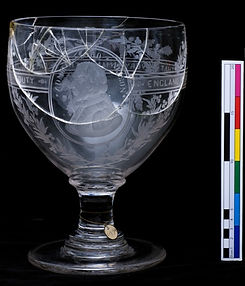 One of my treatment projects in graduate school was this beautiful glass rummer depicting the complicated British war hero Admiral Horatio Lord Nelson. It was commissioned after his death at the Battle of Trafalgar in 1805 (before treatment, left).